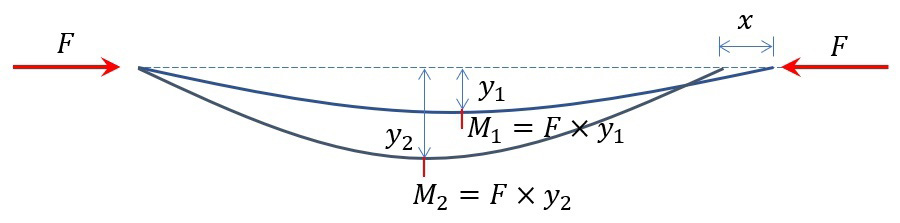 這是因為杠件彎曲與彎矩有關,對于集中力,彎矩可以用類似力*力臂的算法。杠件被壓縮,產生軸向位移x越大,彎曲程度越大,中點偏移軸線距離y越大,彎矩m越大,則使杠件越容易進一步發生彎曲變形,壓縮也變得更容易。