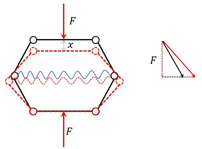 連桿機構中間加一根彈簧,上下施加荷載,隨著豎向位移增加,斜桿傾斜的角度變化,中間結點對彈簧的拉力也變大,使得彈簧更容易被拉長,整體的剛度也就在不斷減小。