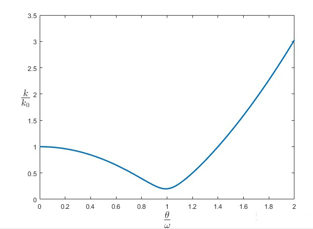 當荷載頻率接近固有頻率時,會出現共振,這時候很小的荷載會引起很大的位移,所以動剛度會出現最小值。