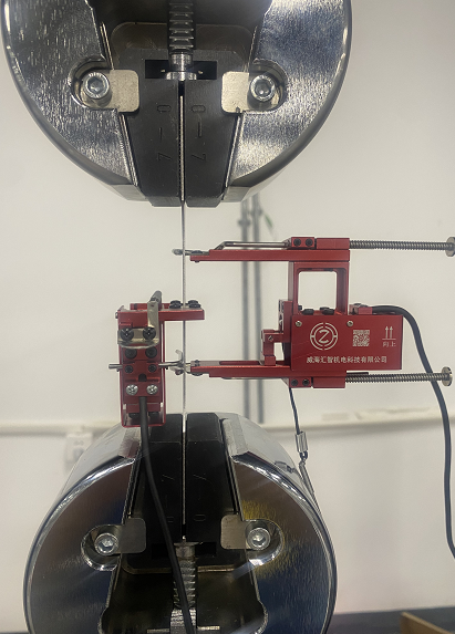 目前,一般的智能電子拉力機都配有計算機及配套軟件,可以實時顯示拉伸曲線,并能記錄實驗過程中的檢測數據。在進行拉伸彈性模量檢測時,一般還需配備引伸計。本文使用三晶電阻應變片式引伸計來測量拉伸彈性模量的方法。